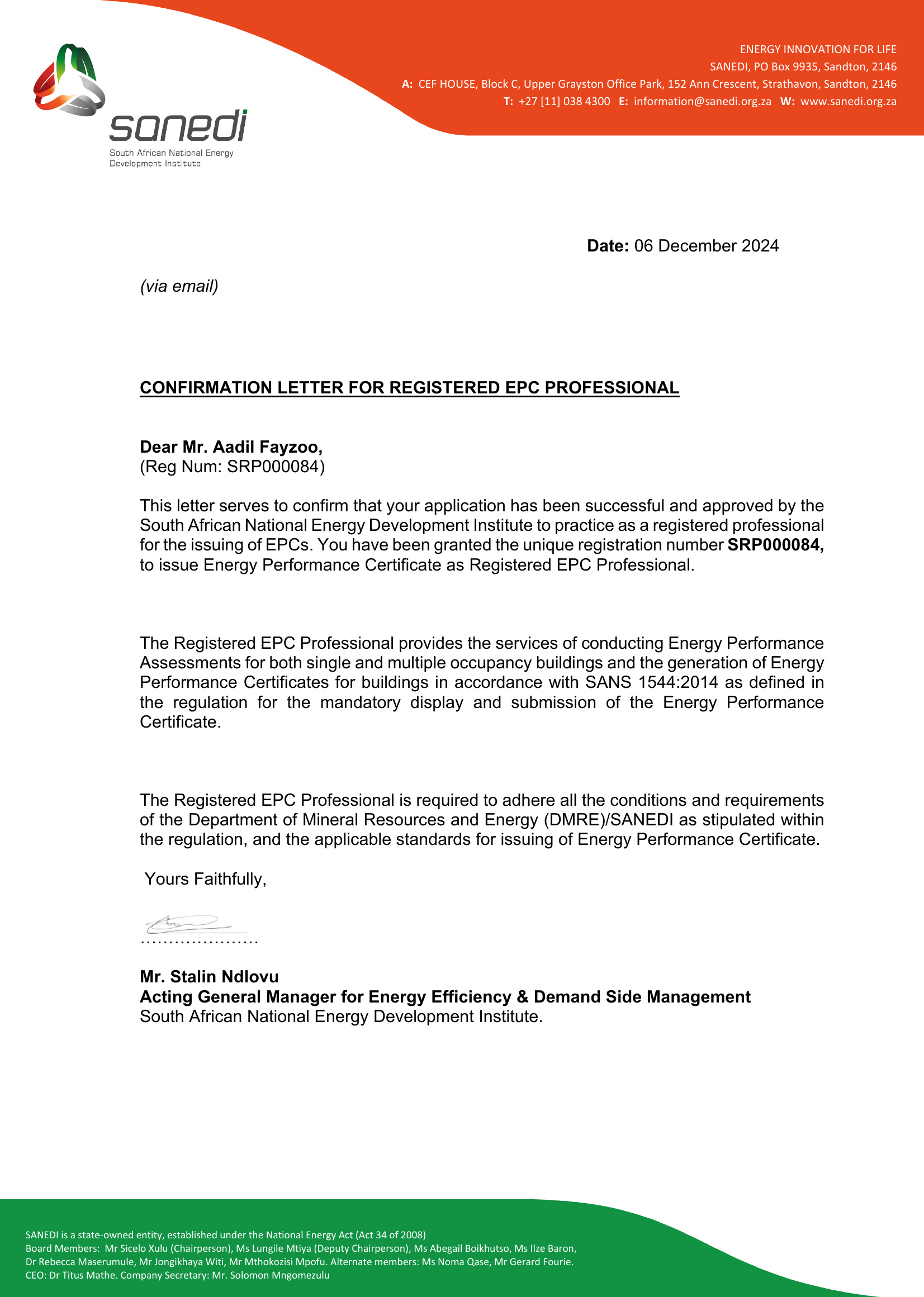 Straight Path Sustainability is proud to be registered with the South African National Energy Development Institute (SANEDI), underscoring our dedication to advancing energy-efficient practices and compliance with national regulations.